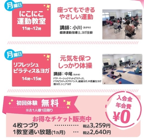 ●料金は1教室通い放題コース、1回800円(4枚つづり)のチケットの販売のみです。